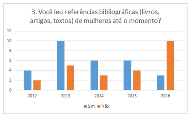 Sobre a dimensão de gênero, ressaltamos três aspectos: em 4 das 5 turmas foram indicado títulos de leituras de autoria feminina, notadamente, as bibliografias elaboradas por professoras dos cursos de graduação e pós-graduação da Universidade X. Há presença de bibliografias de autoras nacionais e estrangeiras. A turma T2016, com 10 dentre 13 respondentes, afirma não ter lido autores do sexo feminino.