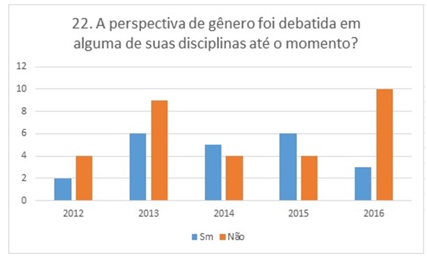 Ainda que várias autoras tenham sido lidas, isso não garante que a perspectiva do gênero seja debatida em algum momento, já que termos relativo equilíbrio dentre respondentes no que se refere à questão de gênero ter sido debatida em algum momento. A turma T2016, com 10 dentre 13 respondentes afirma que não foi debatida. Também perguntamos se o estudante se sente incomodado quando são discutidas temáticas referentes ao empoderamento e relevância das mulheres e obtivemos três respostas, dentre 53, de estudantes que se sentem incomodados.