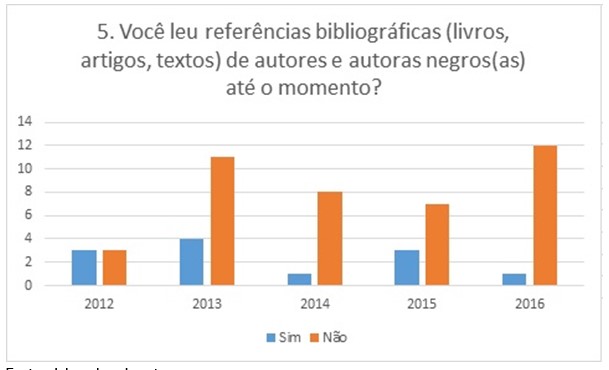 Em segundo, a maioria dos respondentes de todas as turmas afirmam não ter lido referências bibliográficas de autores negros. Isso significa que a perspectiva racial vem sendo discutida pela vertente de autores brancos. Neste sentido, alguns alunos situaram que não veem necessidade em saber se os autores são negros, contudo, são incapazes de citar um autor. Outro aluno diz que “não sei responder, pois esta pergunta não faz sentido, quem lê um livro baseado na cor do autor!”