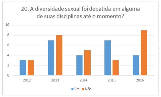 Por último, na dimensão de diversidade sexual, situamos dois apontamentos: a) a diversidade sexual, em termos de propensão ao debate em sala de aula, é a que mais apresenta, em 3 das 5 turmas, maior equilíbrio dentre os que responderam que sim e que não; b) já as turmas T2015 e T2016 apresentam dados diversos enquanto que a maioria da turma T2015 afirma ter debatido a diversidade sexual em alguma disciplina e a maioria da turma T2016 afirma que isso não ocorreu.
