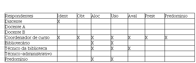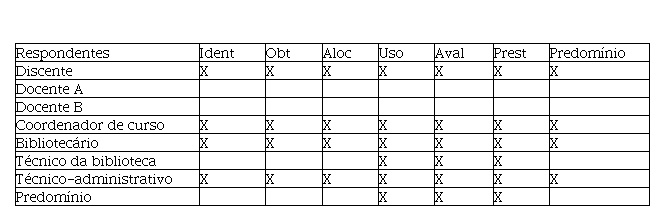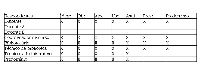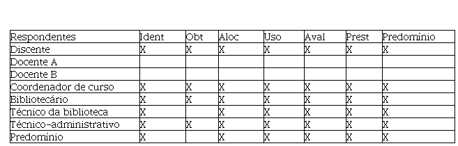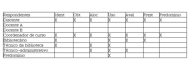 O quadro 9 demonstra que apesar da inclusão de grande parte das categorias na fase de identicação e da exclusão destas mesmas categorias no momento de obtenção, o gerenciamento do uso demonstra uma quase eficiencia desta participação, a qual não ocorre plenamente devido a ausência da categoria docente. Todavia, pouco mais da metade dos representantes - quatro - sentem-se incluídos na avaliação destes recursos e três categorias sentem-se incluidas na prestação de contas destes. Outro fato perceptivel é a não participação das categorias que atuam diretamente neste espaço de aprendizagem - bibliotecário e técnico da biblioteca - no momento de obtenção deste recurso. Isso denota que apesar das duas categorias estarem incluidas na participação da indentificação destes recursos, os mesmos não tem poder de decisão na obtenção deste, sendo esta estapa realizada de forma alheia aos interesses da categoria mais interessadas por este recurso. Por fim, constata-se ainda que o técnico-adminstrativo também está ausente da etapa de obtenção de recursos, configurando-se desta forma a total ausência da categoria dos técnicos nesta etapa: o bibliotecário, que também é um técnico, o técnico da biblioteca e o técnico-administrativo. Para tornar-se participativo, este recurso precisa de maior envolvimento desta categoria.