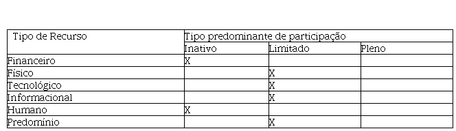 De acordo com entrevista semi-estruturada, identificou-se, de maneira geral, como predominante uma participação do tipo limitada pelas categorias analisadas, conforme demostra o quadro 10, o qual apresenta os resultados obtidos em relação ao tipo predominante de participação por tipo de recurso analisado. Descobriu-se que em dois tipos de recurso configura-se um modelo de participação inativa: financeiro e o humano. O quadro demonstra também que em três tipos de recursos a participação é tida como limitada, sendo esses recursos os físicos, tecnológicos, informacionais. Por fim, constatou-se que não existe um tipo de recurso em que predomina-se a participação plena.
