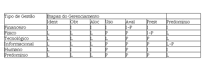 Ainda pela entrevista semi-estruturada identificou-se também como predominante uma participação do tipo limitada pelas categorias analisadas com relação a cada uma das etapas do gerenciamento, conforme o quadro 11. Confirmou-se o predomínio de uma participação inativa na gestão de recursos financeiros e humanos e o uma participação limitada na gestão dos recursos físicos e tecnológicos, conforme identificado anteriormente no quadro 10. Por sua vez a gestão dos recursos informacionais dividiu-se entre três recursos configurados como limitados - identificação, obtenção e alocação - e três recursos configurados como uma participação plena: uso, avaliação e prestação de contas.