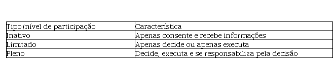 Pode-se sintetizar a participação em três níveis, que podem ser identificados da seguinte maneira: um nível inativo de participação, um nível de participação relativo e um nível de participação pleno. O primeiro nível é momento participativo de apenas consentimentos e recepção de informações, em que se destaca a consulta, relacionamento ou envolvimento mínimo. O segundo é limitado, moderado, em que a participação ocorre de forma restrita, nível relativo de ação ou execução, uma vez que, na maioria das vezes, o poder de decisão não está plenamente identificado. O terceiro é quando a participação realmente ocorre, ou seja, o nível que pode ser denominado como participação plena. Aqui é sugerido o envolvimento de forma ativa, em que cada um dos indivíduos tem o poder delegado e que permite máxima participação no processo decisório, na execução dessas ações e, fundamentalmente, na aceitação das responsabilidades que as consequências dessas ações podem trazer, como mostra o quadro 1, que sintetiza esse arranjo teórico:
