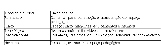 O modelo teórico deste estudo, quadro 2, estrutura os recursos em cinco tipos: financeiros, físicos, tecnológicos, informacionais e humanos. Isso significa que gerenciar recursos é lidar com esses cinco tipos pelas etapas de identificação, obtenção, alocação, uso e avaliação do uso desses recursos. Os recursos financeiros dizem respeito à toda espécie de dinheiro; recursos físicos são tanto instalações, máquinas e equipamentos, quanto os insumos, como materiais de laboratórios e materiais didáticos; recursos tecnológicos são os meios inteligentes requeridos para realizar as atividades do espaço pedagógico, assim como a permissão de conexão dessas atividades; recursos informacionais são os meios utilizados para fazer fluir as informações entre os integrantes daquele espaço e entre o espaço e a organização de que faz parte; e recursos humanos são as pessoas que atuam no espaço pedagógico, como mostra o quadro 3.
