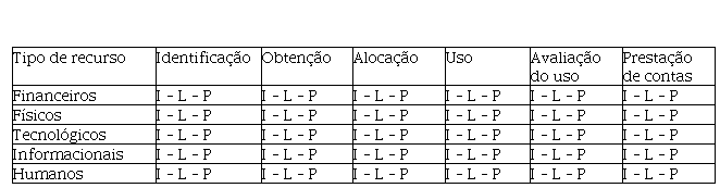 participação ou não das categorias representadas por cada sujeito em cada um dos cinco tipos de recursos (financeiros, físicos, tecnológicos, informacionais e humanos), os quais estarão representados em planilhas, neste estudo denominadas quadros.