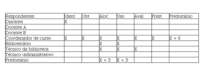 O coordenador do curso é quem participou de todo o processo. Em segundo lugar aparece o técnico da biblioteca e o bibliotecário. Com relação às etapas do processo de gerenciamento, como mostra o quadro 5, a alocação e uso dos recursos foram as etapas que receberam mais participantes, em um total de quatro dentre os sete constantes da amostra. As outras quatro receberam, no máximo duas participação, como é o caso da identificação dos recursos e da avaliação. Também aqui não há participação efetiva no gerenciamento dos recursos financeiros.