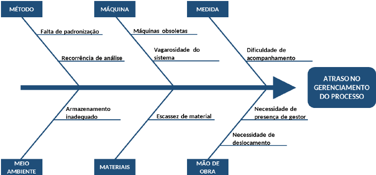 A etapa 2 objetivou identificar possíveis relações de causas e efeitos, bem como apresentar prováveis soluções para a resolução da situação diagnosticada. Utilizando-se do Diagrama Ishikawa, a figura 2 expõe as principais causas para o atraso nas análises do processo.