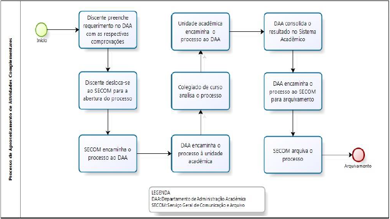 O interessado, como passo inicial para abertura do processo de aproveitamento de atividades complementares, dirige-se, com as respectivas comprovações, ao Departamento de Administração Acadêmica para preenchimento de requerimento. De posse da documentação o interessado desloca-se, em seguida, ao Serviço Geral de Comunicação e Arquivo para efetivar a abertura do processo. No setor, o interessado deposita a documentação e informa-se do número do respectivo processo.