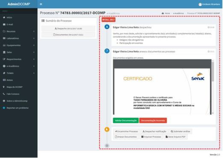 O sistema e-Acadêmico de aproveitamento de atividades complementares possui um protótipo e encontra-se em fase de testes de funcionalidades no portal Admindcomp, com telas desde a abertura do processo até a possibilidade de seu arquivo - como a análise do processo, figura 4, diferencial por disponibilizar as informações do processo no estilo de linha do tempo, por meio da qual é possível visualizar todas as ocorrências registradas no processo de forma dinâmica e panorâmica.