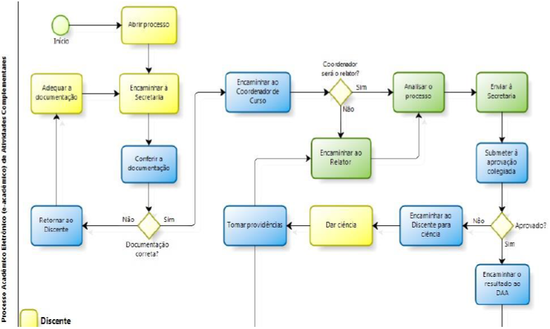 A criação do módulo do e-Acadêmico para o processo de atividades complementares considerou o fluxo de processo apresentado na figura 5, prevendo a participação de discentes, de servidores, de relatores e de coordenadores de curso e tornando o procedimento mais restrito à unidade acadêmica.