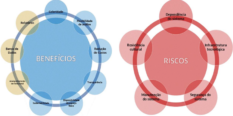 De modo geral, no tocante a benefícios, o processo eletrônico tem como principal qualidade o aumento da celeridade no gerenciamento durante as fases do processo - instauração, instrução, relatório e decisão (Cunha Junior, 2016). Ademais, com a possibilidade de acesso e análise em qualquer tempo e lugar, a implantação do processo eletrônico diminui consideravelmente o tempo de vida do processo, favorecendo tanto o requerente quanto a organização. Com base na escassez de recursos - financeiro, material, pessoal - a redução de custos torna-se outra importante vantagem da implantação do processo eletrônico. O processo eletrônico também coopera para maior transparência dos atos da administração pública, uma vez que as ações registradas nos autos podem ser acompanhadas em tempo real pelos envolvidos no processo. Com a eliminação do uso de papel, a implantação do processo eletrônico contribui para a redução da necessidade de espaços físicos para armazenamento dos processos e para uma administração mais sustentável.