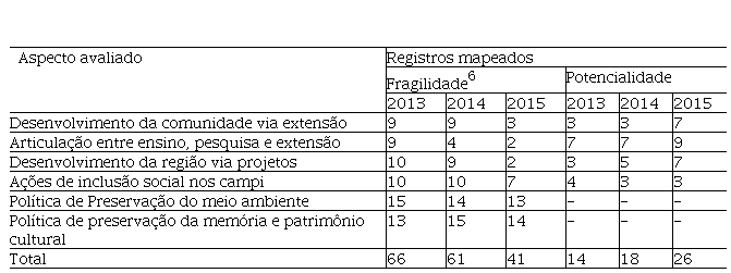 Os registros comprovam que os pontos mais críticos se encontram nos aspectos voltados para a inclusão social, a política de preservação do meio ambiente e a preservação da memória e do patrimônio cultural nos campi que compõem a unidade estudada. Embora o relatório final de 2017 não tenha sido disponibilizado, o que impossibilitou o seu mapeamento, os dados parciais publicados reiteram as fragilidades apontadas nos três anos mapeados na tabela 2.