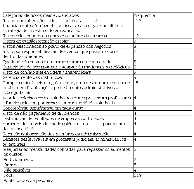 Na tabela 4 são apresentadas as sentenças classificadas conforme o tipo de risco. Observou-se que o risco mais evidenciado foi o de mercado, tendo em vista eventual alteração da estratégia do governo de investimento em educação por políticas de financiamento ou benefícios fiscais, bem como as mudanças tecnológicas no setor e o uso da tecnologia.
