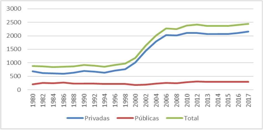 Nos últimos anos o Brasil tem experimentado mudanças significativas na oferta e concepção do ensino superior, que passou a contar, desde 1996, com o aumento significativo no número de IES privadas, conforme pode ser visto na figura 1.