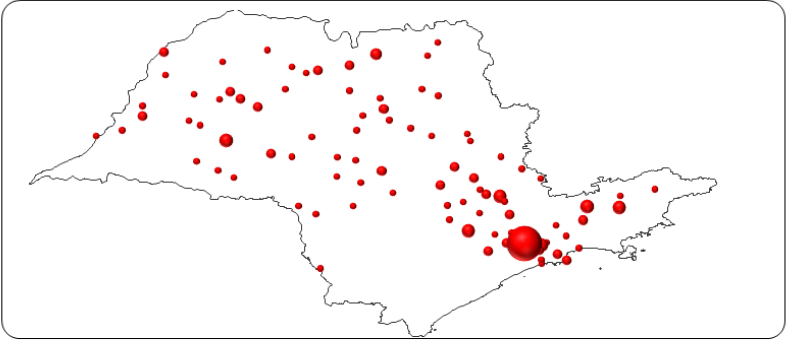 O mapa representado na figura 2 ilustra a distribuição de Pmies no Estado de São Paulo, que apresenta assimetria na região Sudeste do Estado. É importante destacar que tal assimetria não está relacionada ao processo de amostragem, mas ao perfil da distribuição das Pmies no Estado, visto que a amostra foi obtida por amostragem sistemática, onde o sistema criado estava relacionado à ordem decrescente dos valores de IGC e não tinha nenhuma relação com a localização das Pmies. Registra-se que o volume de cada esfera apresentada na figura 2 é diretamente proporcional à frequência de Pmies da amostra.