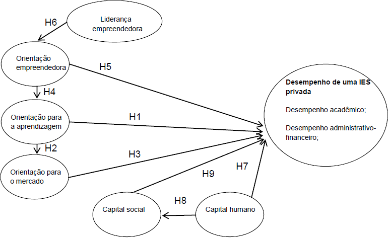 Nos estudos de Naman e Slevin (1993), assim como em Fernandes e Santos, constatou-se que a orientação empreendedora influencia positivamente a orientação para a aprendizagem, assim como o desempenho organizacional. Diante dessas evidências estabeleceram-se as seguintes hipóteses: H4: a orientação empreendedora influencia positivamente e indiretamente o desempenho das Pmies, por meio da orientação para a aprendizagem. H5: a orientação empreendedora influencia positivamente e diretamente o desempenho das Pmies privadas.