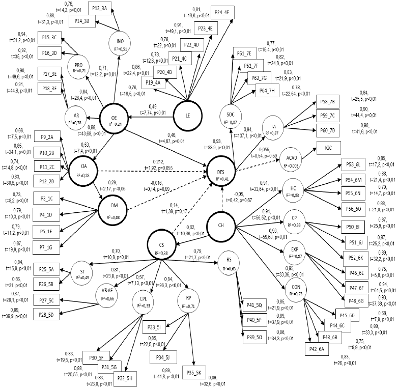 O desenho do modelo ajustado apresenta as correlações entre as variáveis observáveis e as variáveis latentes nos modelos de mensuração, os valores dos coeficientes de determinação para todas as variáveis endógenas, os valores dos coeficientes de caminho da regressão linear entre as variáveis latentes e os testes de significância estatística de todas as relações. Na figura 5 apresenta-se o modelo estrutural e modelos de mensuração ajustados.