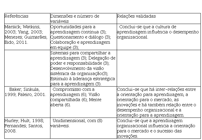 Ao considerar os estudos que trataram a cultura de aprendizagem é possível observar que tal fator influencia o desempenho das organizações e se inter-relaciona com outros fatores, tais como a orientação para o mercado e o sucesso das inovações. No quadro 1 apresenta-se as dimensões e o número de variáveis utilizadas para a operacionalização do fator.