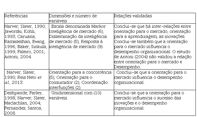 Ao considerar os estudos que trataram a orientação para o mercado é possível observar que tal fator influencia o desempenho das organizações e se inter-relaciona com outros fatores, tais como a orientação para a aprendizagem e o sucesso das inovações. No quadro 2 apresenta-se as dimensões e o número de variáveis utilizadas para a operacionalização do fator.
