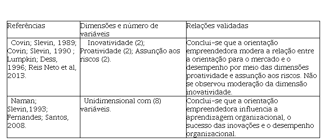 Ao considerar os estudos que trataram a orientação empreendedora é possível observar que tal fator influencia o desempenho das organizações e se inter-relaciona com outros fatores, tais como a orientação para a aprendizagem e o sucesso das inovações.