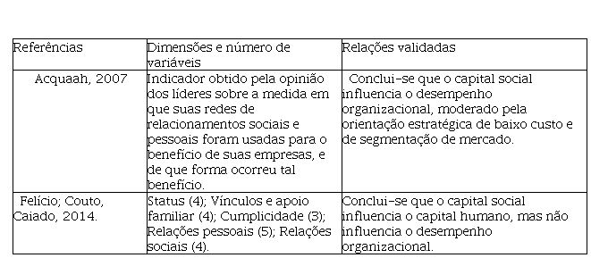 Com base nos estudos de Acquaah (2007) o capital social dos principais líderes influencia o desempenho das organizações, mesmo que medido de maneiras diferentes. Com base nesses estudos Felício, Couto e Caiado (2014) pesquisaram a relação entre capital humano, capital social e desempenho mas não encontraram relação significante entre capital social e desempenho, como pode ser observado no quadro 6.