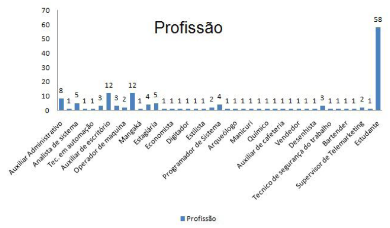 Foram encontrados variados ramos profissionais ao se entrevistar os participantes. Desde computação até área saúde. A maioria dos entrevistados estava cursando o ensino superior ou médio por isso o grande número de estudantes que aparece no gráfico. O evento é realizado no período de férias escolares, possibilitando assim a participação de um grande número de alunos.