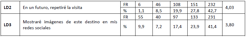Tal y como se puede observar en la tabla 4, destacamos en la gran mayoría de los ítems unas valoraciones superiores a tres (sobre 5), y en muchos casos, valoraciones cercanas a cuatro (sobre 5), por lo que tanto la experiencia del servicio y la lealtad hacia el destino son evidentes.