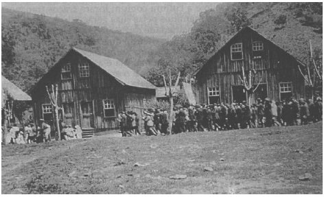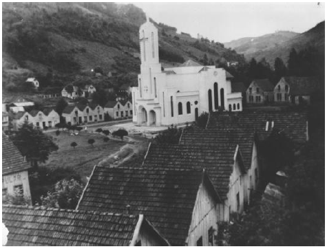 Para os operários foram construídas mais casas de alvenaria, além de serem adquiridas algumas casas particulares pela empresa. Em 1939 foi iniciada a construção da Igreja Matriz, na praça central em frente às residências operárias (figura 2). Além das moradias, a vila operária havia interiorizado um conceito de comunidade que foi expandido, em função dos interesses da fábrica e da população, criando aporte de edifícios de cunho social. A vila atendia a todas as necessidades dos operários à medida que possuía escola, igreja, praça, campo de futebol, uma cooperativa que oferecia uma série de serviços, um sindicato e inclusive, mais tarde, um cinema. Ou seja, os operários tinham suas necessidades supridas no local onde trabalhavam, que era o mesmo local em que moravam.