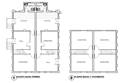 No conjunto operário, as casas duplas remanescentes contam com seis exemplares, todas construídas em tijolos aparentes. Esta tipologia apresenta projetos racionais, geometrias simplificadas e funcionalidade espacial. Contemplam espaços de convivência, como sala e cozinha, com concentração da área molhada aos fundos, e o setor íntimo, com três dormitórios, disposto entre os dois pavimentos (figura 5). Todos os ambientes possuem boas condições de ventilação e iluminação, que segundo a Carta de Atenas (Iphan, 1933, p.7), são ‘condições naturais’ necessárias às cidades [sol, espaço, vegetação].