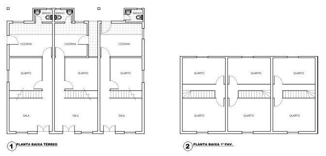 Da mesma forma, os três blocos geminados, de mesmo material, que contemplam três residências cada, apresentam racionalidade e funcionalidade como característica. Seu projeto (figura 7) é distribuído de tal forma que permite que todos os compartimentos possuam janelas para ventilação e iluminação natural, mesmo na unidade do meio. As áreas molhadas – banho e cozinha- também ficam concentradas nos fundos da edificação, e cada casa possui três quartos.