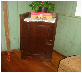 Faz-se necessário destacar, ainda, um armário [Figuras 15 e 16] e uma cela de cavalo [Figuras 17 e 18], dois artefatos que não tiveram uso turístico mas possuem importância simbólica. O primeiro pertencia a Thereza e, na ampliação da Pousada, foi transferido para a cozinha, sendo utilizado para uso da família.