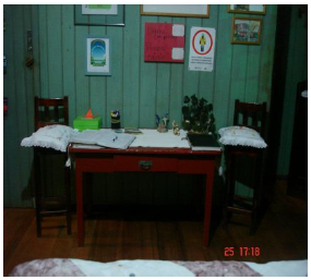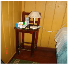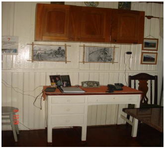 Quanto a outros objetos, como as mesas de escritório e o cofre de madeira, pertencentes a Egídio, e o sofá, pertencente à Thereza (Figuras 11 e 12), além da função decorativa, servem para guardar informações aos turistas e anotações de reservas dos hóspedes (Figura 13), sendo também mesa do telefone. Já uma cadeira torna-se criado mudo para o quarto de turistas (Figura 14).