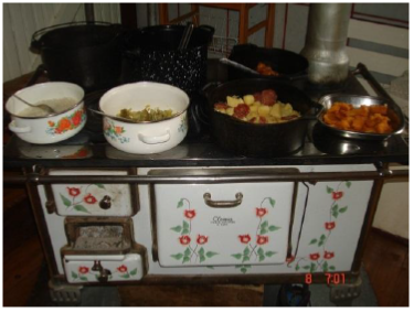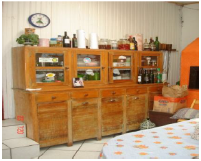 Ainda em relação às mudanças, com a perda da mãe, até então responsável pela alimentação, Nelci passou a responder pelos aspectos que envolvem a organização da mesma para os hóspedes, como as tarefas de cozinhar e de servir. Esta última tarefa foi, inclusive, alterada. Houve a adaptação do fogão a lenha, transformado em bufê. Esse artefato, até então utilizado na preparação de alimentos, passou a fazer parte do contexto da autenticidade encenada para o turista, permanecendo, ainda, enquanto objeto de memória para a família [Figuras 1 e 2].