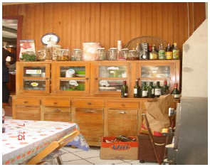 Aquele armário é da época do casamento da vó, têm uns 50 anos. Não, daí quando eu era criança, tinha louça na parte de cima, mas as tuias20, que continua tendo tuia hoje. E, por exemplo, nós usamos ele hoje, ali, para guardar coisas, guardanapo... Tinha uma tuia que era dos remédios do vô, uma tuia que era os remédios da vó, coisas assim que era fácil, né, era só puxar que estava ali. E as louças usava na parte de cima, que era o armário que a vó mandou fazer quando casou, é que meu bisa deu para ele, o bisa era muito organizado, de dar as coisas para as filhas. Eu gosto muito deste balcão, vamos ter que pintar e dar uma ajeitada nele (Lurdes, 2011).