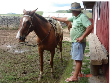 É assim né, o vô me ensinou muita coisa, a tocar gaita. Ganhei dele a gaita ponto e ele também me ensinou a trabalhar. Nós dois ficava muito tempo junto, era praticamente eu e ele na lida de gado, o pai antes ficava mais com as coisa do turismo. Daí, quando ele [Avelino] ficou doente, ele me deu de presente esta cela, mas daí como o pai também gostava muito dele e sempre gostou desta cela, eu deixei pro pai usar, mas é minha, de herança do vô, eu conheci estas terra com ele, até é difícil pra mim usa as coisas que ele me deu, é uma coisa que é da vida da gente, ele via a vida de cima deste cavalo (Pedro, 2011).