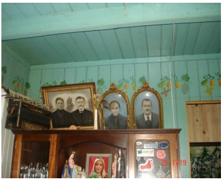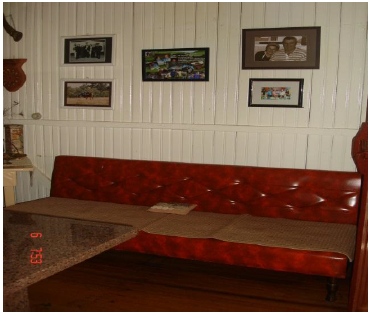 O objeto referenciado por Nelci é a canastra, que pertencia a seu avô e tinha duas utilidades: era usada para o transporte [a cavalo inicialmente e, após, de carro] dos vestidos de festa e, em casa, como guarda roupa, em que eram guardados os mesmos vestidos. A canastra, feita de madeira e forrada com couro de boi, foi construída na própria fazenda. Seu design imita a mala usada pelos antigos tropeiros para carregar bagagem em viagens. O objeto está exposto, juntamente com o cofre, a mesa que serve de balcão para folhetos turísticos e a vitrola, na sala de recepção aos turistas, antiga sala de visita da fazenda. A referida sala também é decorada com quadros de quatro gerações da família19, que, segundo Lurdes, continuarão ocupando as paredes [Figuras 5 e 6], pois foram colocados pelas bisavós, devendo ser preservados. Vejamos o relato da entrevistada: