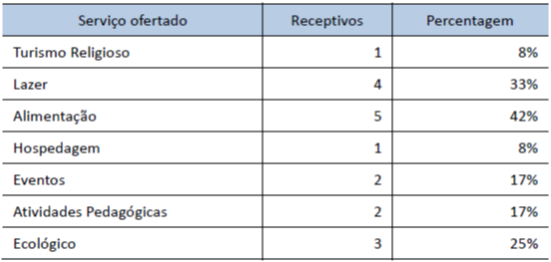 Quanto ao tipo de serviço oferecido tem-se que a alimentação representou o maior percentual [Tabela 1]. Os resultados encontrados superam 100%, pois os respondentes tinham a oportunidade de identificar mais de um serviço. Chama a atenção que o item ‘hospedagem’ foi marcado por apenas um receptivo.