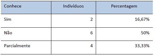 Quanto à questão de Políticas Públicas e Legislação somente 16,67% afirmaram conhecer as políticas públicas e legislação voltadas para o turismo (Tabela 4). Dos demais, 50% desconhecem qualquer política pública ou legislação voltadas ao turismo e 33,33% conhecem parcialmente, já tendo ouvido falar a respeito, mas sem saber citar algum exemplo específico.