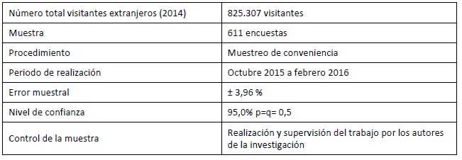 Si bien las cifras no representan el número total de turistas extranjeros, no todo viajero tiene por qué llegar a Santo Domingo vía aérea, al menos nos permite hacernos una idea del posible tamaño y evolución de la demanda turística internacional de esta ciudad. Tomando como referencia las estadísticas de llegadas de extranjeros al aeropuerto internacional Las Américas se puede inferir que el universo de estudio es de 825.307 visitantes. Tomando como referencia esta cifra, el error muestral para un nivel de confianza del 95% sería ± 3,96%. La ficha técnica de la investigación se presenta en la tabla 2.