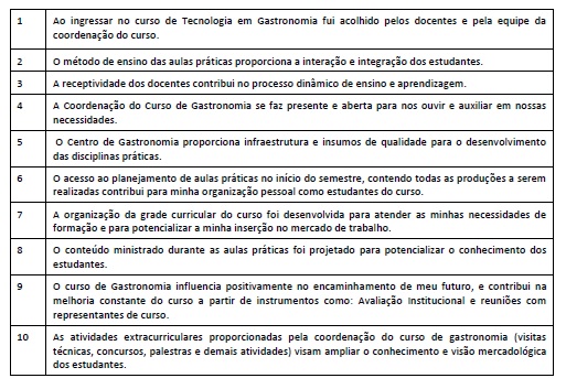A questão 1 [Ao ingressar no curso de Tecnologia em Gastronomia fui acolhido pelos docentes e pela equipe da coordenação do curso] obteve a média de 24, 71% para a alternativa 1, enquanto a da alternativa 2 recebeu 51,15”, mais do que o dobro. Já a questão 3 [A receptividade dos docentes contribui no processo dinâmico de ensino e aprendizagem], a alternativa 1 recebeu 31,21% e a alternativa 2, 45, 09%. Visto pelo prisma da hospitalidade, pode-se considerar que pelas respostas das questões 1 e 3, a recepção é, apenas, cumpridora, não causando um impacto que exceda as expectativas. Indiscutivelmente estes resultados indicam a necessidade de melhorar a recepção aos alunos.