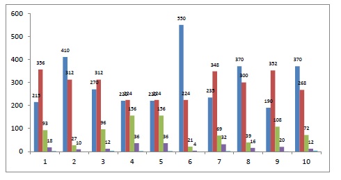 Como se pode perceber há uma predominância de respostas para as alternativas 1 e 2 em todas as questões. O resultado indica uma concordância com as proposições, embora se possa destacar que as questões 1, 3, 7 e 9 tiveram maior incidência sobre ‘Concordo’ ao invés de ‘Concordo Plenamente’. Deve-se comentar as questões fora da média. Da mesma forma deve-se apontar que os resultadsos são muito positivos e que a análise a seguir buscou ser mais rigorosa no que concerne aos detalhes dos resultados em busca de melhoras para o curso.