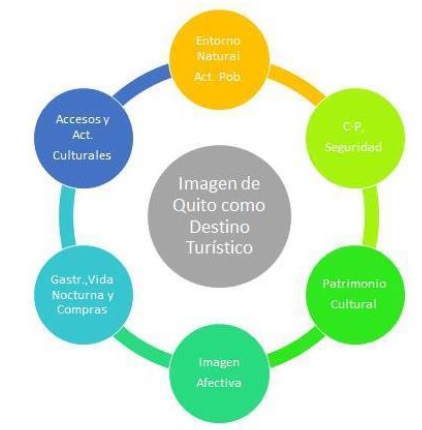 La imagen de Quito está integrada por 5 dimensiones cognitivas y una afectiva, siendo las primeras las que afectan en mayor medida a la imagen de la ciudad. Quito como destino turístico está muy cercano a muchos lugares de interés, presenta oportunidades para el turismo de aventura, con un patrimonio histórico y cultural único, con muchos sitios de interés cultural para visitar, todo ello la identifican como un claro ejemplo de ciudad colonial que evoca emociones y que la caracterizan como medio agradable, algo divertida, algo excitante y algo relajante.