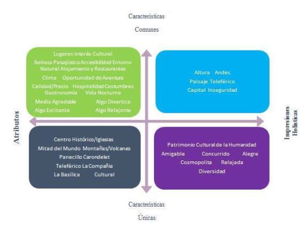 La imagen preconcebida de Quito como destino turístico, a partir de los tres continuos bipolares propuestos por Echtner y Ritchie (1991, 1993, 2003): atributo-holístico, funcional-psicológico y común-único, se representa en la Figura 2.
