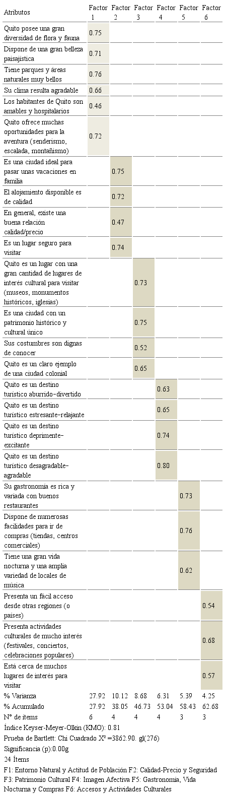 Con base en los resultados del análisis factorial se puede reducir las percepciones a 6 dimensiones o factores, relacionados con los atributos seleccionados de la literatura turística y que fueron adaptados a las características del Distrito Metropolitano de Quito: F1 Entorno Natural y Actitud de Población, F2 Calidad-Precio y Seguridad, F3 Patrimonio Cultural, F4 Imagen Afectiva, F5 Gastronomía, Vida Nocturna y Compras, F6 Accesos y Actividades Culturales. A continuación se muestra una figura representativa de la imagen de Quito basada en la técnica estructurada. La Tabla 4 expone la agrupación referida.