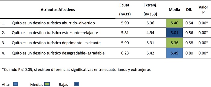En lo que respecta a los atributos afectivos se considera que Quito es un destino agradable, divertido, excitante y relajante, en ese orden, con discrepancias significativas entre los dos grupos en todos los casos. Si nos aproximamos hacia valoraciones más reales, se debe categorizar a Quito como un destino medio agradable para los turistas nacionales, y algo agradable para los internacionales, algo divertido y algo excitante en ambos casos, algo relajante para ecuatorianos y ni relajante ni estresante para extranjeros.