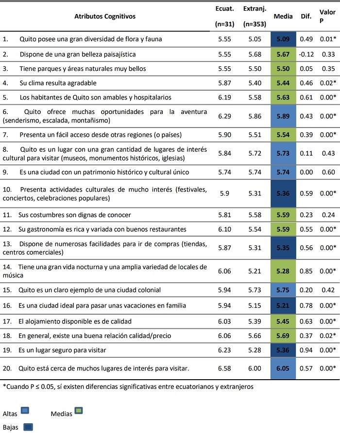 La imagen a priori de Quito como destino es relativamente positiva, ya que no se registran puntuaciones medias menores a 4, que es un estado neutral; en casi la totalidad de las puntuaciones la percepción de los nacionales es más positiva que la de los extranjeros, evidenciando al momento de procesar la información notables diferencias entre los dos grupos por las distancias culturales.