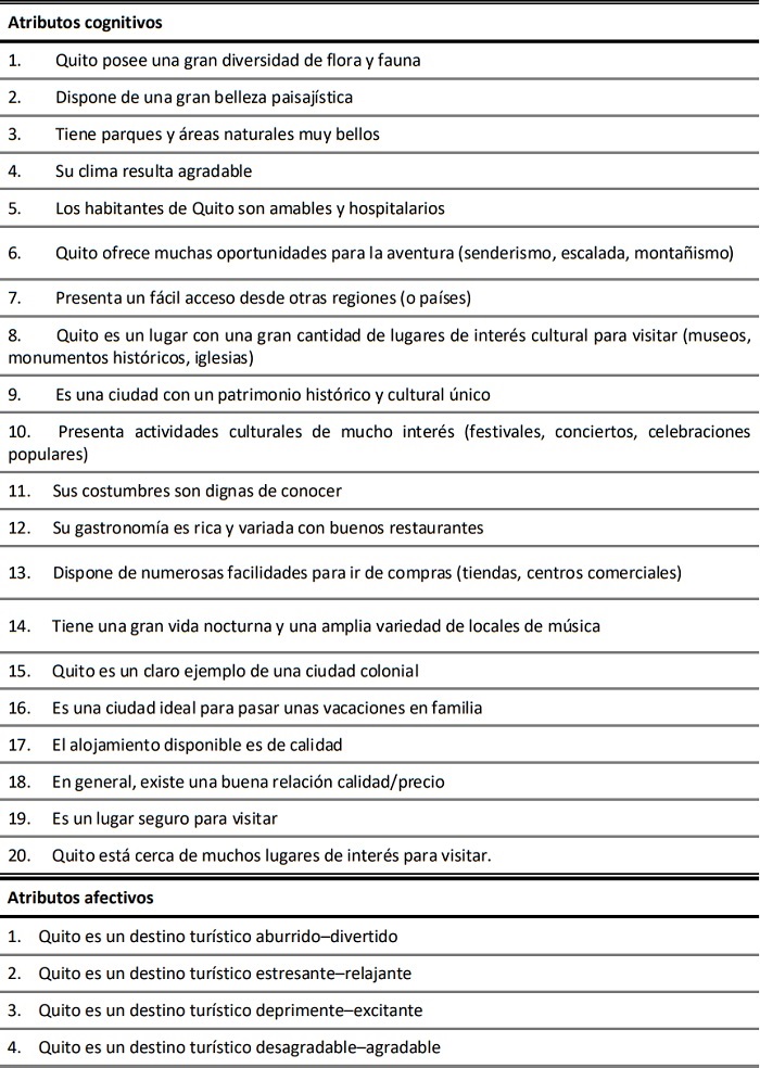 Para el desarrollo del trabajo se optó por una metodología tanto cualitativa como cuantitativa. En el primer caso se aplicó una entrevista en profundidad a catorce líderes de opinión del sector público y privado, vinculados a la gestión y promoción del destino, prestación de servicios turísticos y actividades comerciales. Esto con la finalidad de validar una cartera de atributos extraídos de la literatura turística. La batería final de atributos [20 de tipo cognitivo y 4 de tipo afectivo] se muestra en la Tabla 1. Para validar las opiniones de los entrevistados se utilizó el método de agregación individual de expertos.