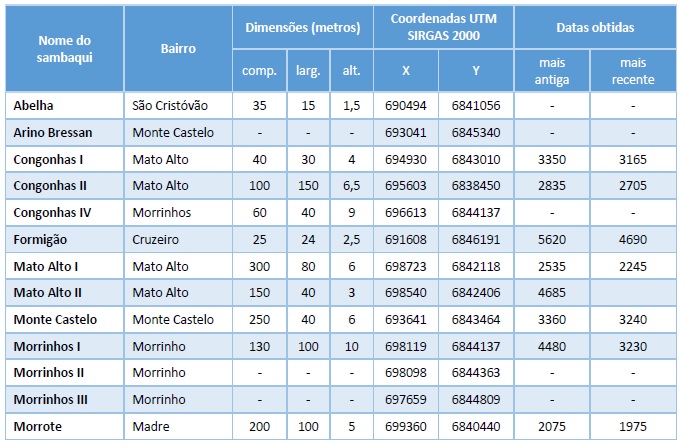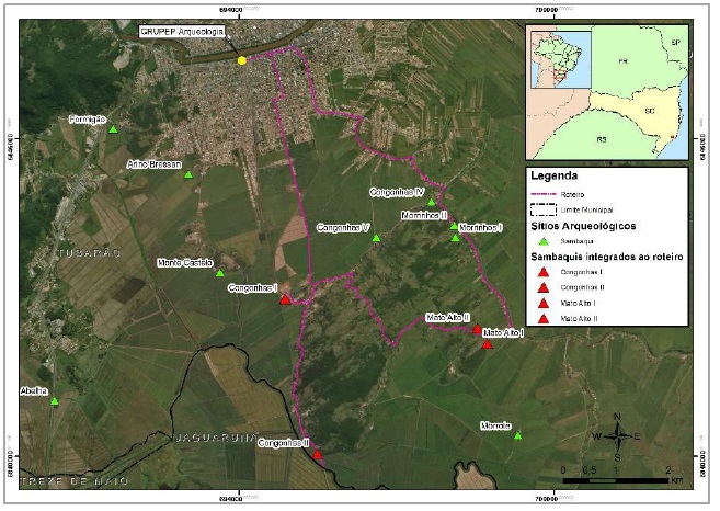Para a estruturação do roteiro, elencaram-se quatro Sambaquis, localizados nos bairros onde foram realizadas as entrevistas: Congonhas, onde estão os sítios Congonhas I e Congonhas II; e o Bairro do Mato Alto, onde se encontram os sítios Mato Alto I e Mato Alto II. O roteiro [] possui um percurso de 27 quilômetros de distância, partindo do centro da cidade, passando por outros bairros, que também possuem sítios arqueológicos, mas que não foram acrescidos ao roteiro. O roteiro terá uma duração aproximada de três horas, saindo da Universidade do Sul de Santa Catarina [Unisul], das dependências do Grupo de Pesquisa em Educação Patrimonial e Arqueologia, seguiria pela Av. Marcolino Marechal Deodoro para o Sambaqui Mato Alto I ().