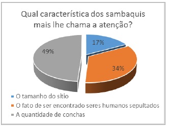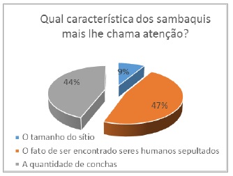 Para Alves e Silva (1992), a “análise qualitativa se caracteriza por buscar um a apreensão de significados na fala dos sujeitos, interligada ao contexto em que eles se inserem e delimitada pela abordagem conceitual [teoria] do pesquisador, trazendo à tona, na redação, uma sistematização baseada na qualidade, mesmo porque um trabalho desta natureza não tem a pretensão de atingir o limiar da representatividade” (p. 65). Percebe-se na aplicação da pesquisa, que a maioria dos entrevistados já ouvira sobre os Sambaqui, sendo que um percentual menor [9% adultos e 6% estudantes] responderam desconhecer esse tipo de sítio arqueológico. Quando questionados acerca da existência de Sambaquis na comunidade, novamente tem-se um resultado positivo, visto que, 83% dos entrevistados adultos responderam afirmativamente, bem como 89% dos estudantes mostram-se cientes de tal ocorrência. O reconhecimento por parte da comunidade da presença de Sambaquis na localidade, contribuiu para se compreender o quanto aquela localidade conhecia sobre o patrimônio local. Esse dado pode ser um indicador importante no entendimento da relação daquelas pessoas com os sambaquis, se há um processo de pertencimento, uma preocupação com a preservação, e ainda, se há possibilidade de se desenvolver atividades envolvendo esse tipo de patrimônio com o apoio da comunidade. Indagou-se sobre qual característica dos Sambaquis eles destacariam. Para os adultos o que mais se destaca e surpreende é o fato de haver sepultamentos humanos no local, contudo no universo infanto-juvenil o que lhes chama mais atenção é a numerosa quantidade de conchas, acumuladas por centenas de anos pelos grupos pescadores-caçadores-coletores.